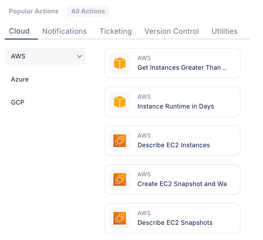 Action steps execute specific actions within the workflow. We support multiple action steps in multiple areas, like cloud commands, notifications, ticketing, and utilities.