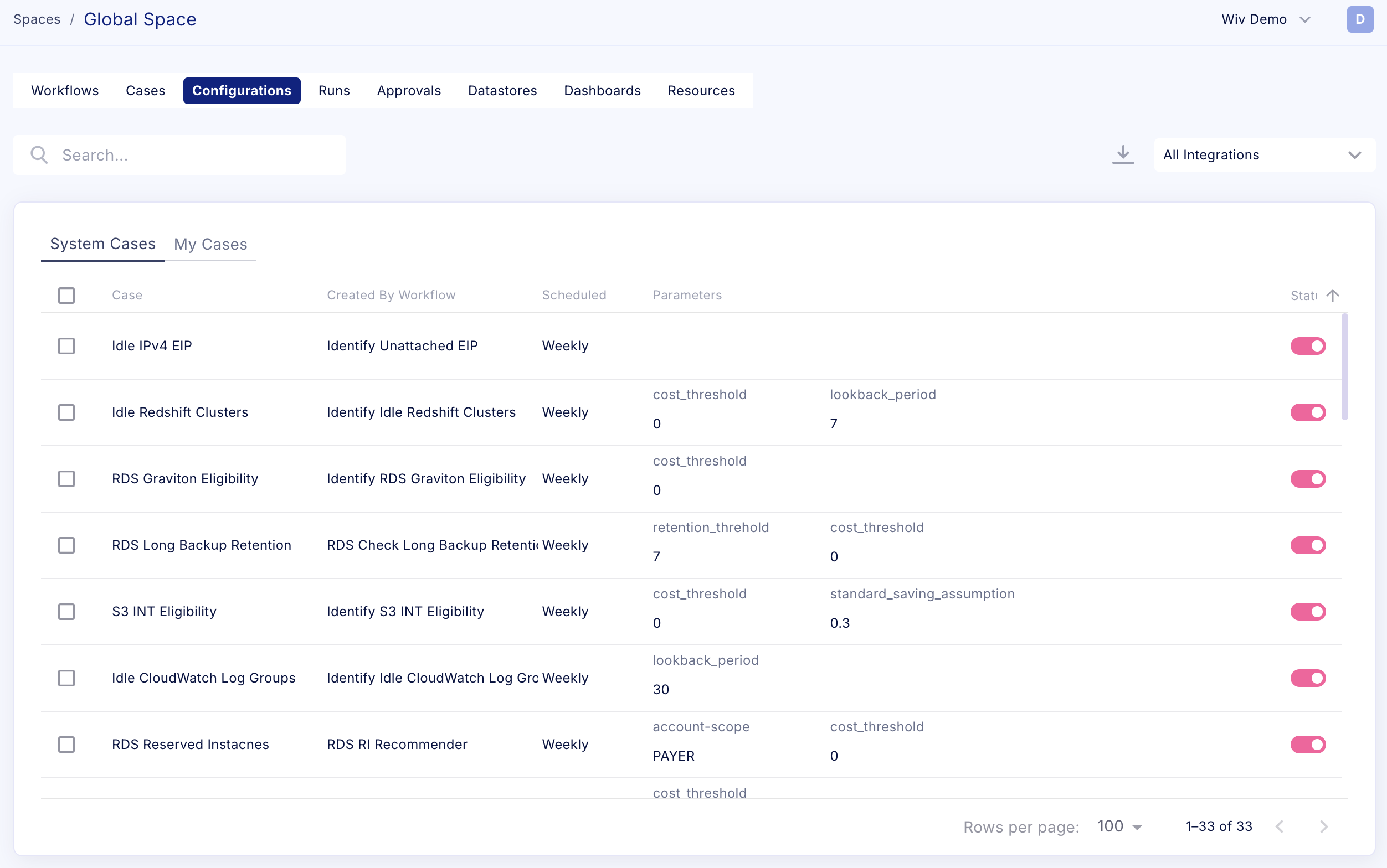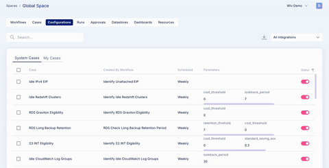 System workflows are maintained by the Wiv team and are provided as read-only. These workflows are designed to minimize time to value (TTV) after onboarding. When a customer joins the platform, these system workflows are automatically added to their tenant, allowing immediate execution to generate optimization cases.