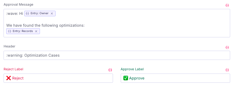 • Reject Label / Accept Label: Customize the approval and rejection button text to clearly indicate the action's outcome (for example, when reviewing anomaly alerts, you might use "Confirm Anomaly" / "Dismiss Alert"). This helps users understand the consequences of their selection and improve the feedback loop context