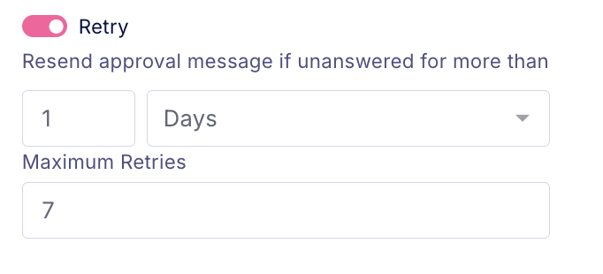 The retry automation feature helps you manage unresponsive approvals. Set urgency-based reminder intervals, and the system will automatically send gentle nudges to recipients who haven't acted on your request. This ensures no approval gets lost in the shuffle and helps you track pending responses without manual intervention.