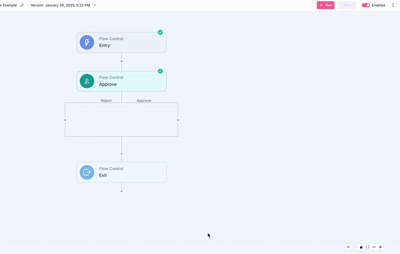 The Approve step is a flow control mechanism that pauses workflow execution pending human approval. It's designed for scenarios where automated processes require human verification before proceeding with critical actions.