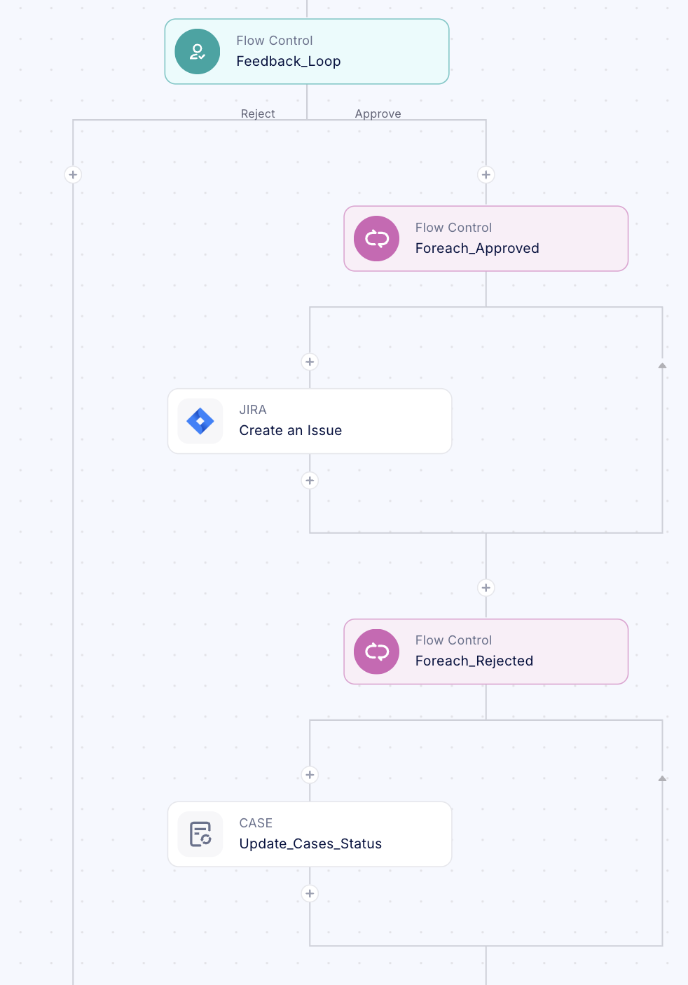 In the example above, we are using a Loop in order to iterate on each item, and update the Cases Status and opening a Jira issue by utilizing Workflow Automations.