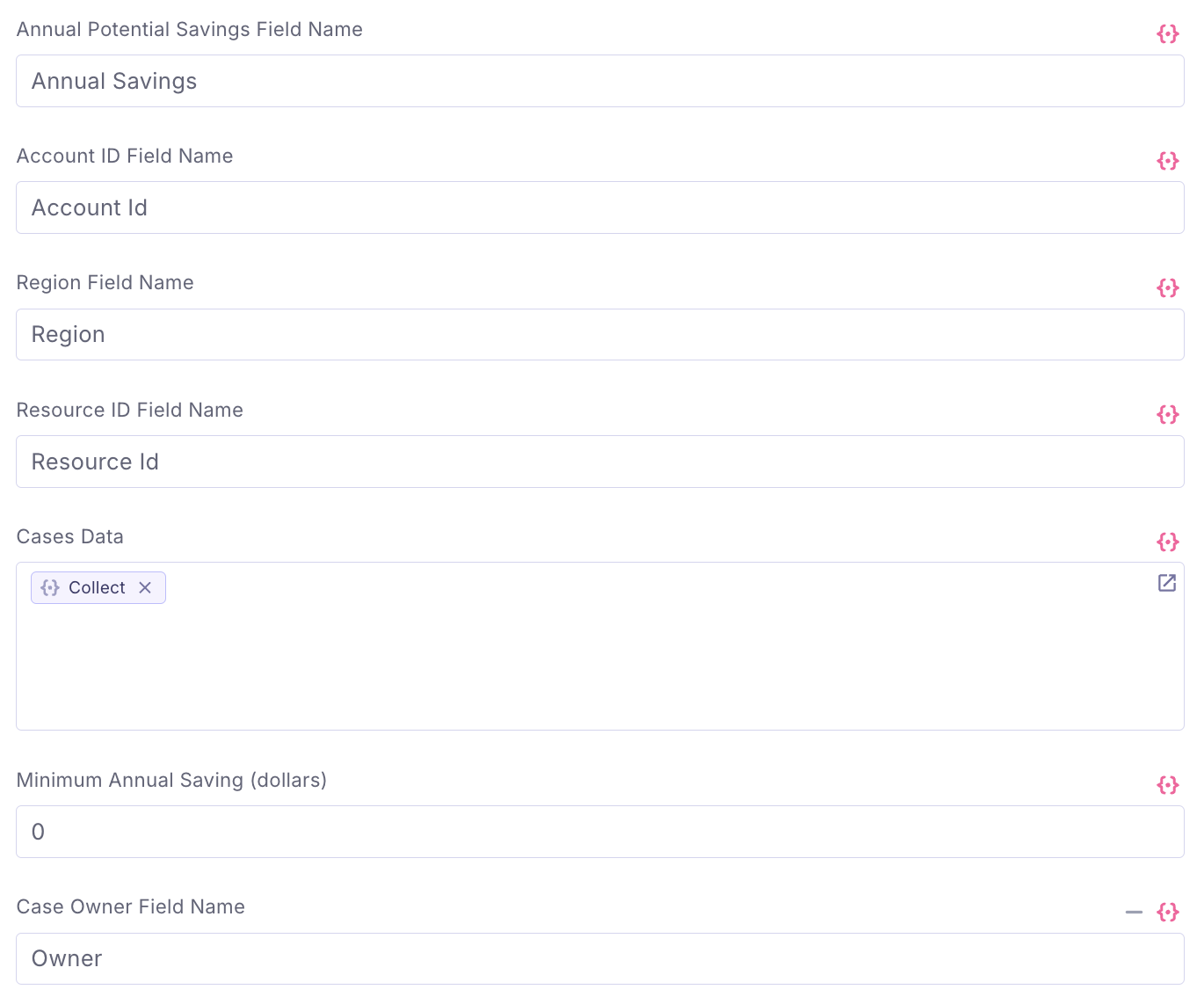 We will need to add the same fields in the Write Cases step. The field names are case sensitive, and they point the Write step to the right fields in your data structure that correlated to the annual savings, account id, region, and resource id. Note that if you already have the Owner allocation, you can map it as the Case Owner.
