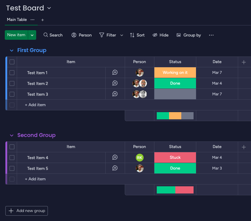 In order for us to achieve this, the first thing we will need is an API key for Monday.com, and a board that we will work on. For our example, we have created a test board that looks like this: