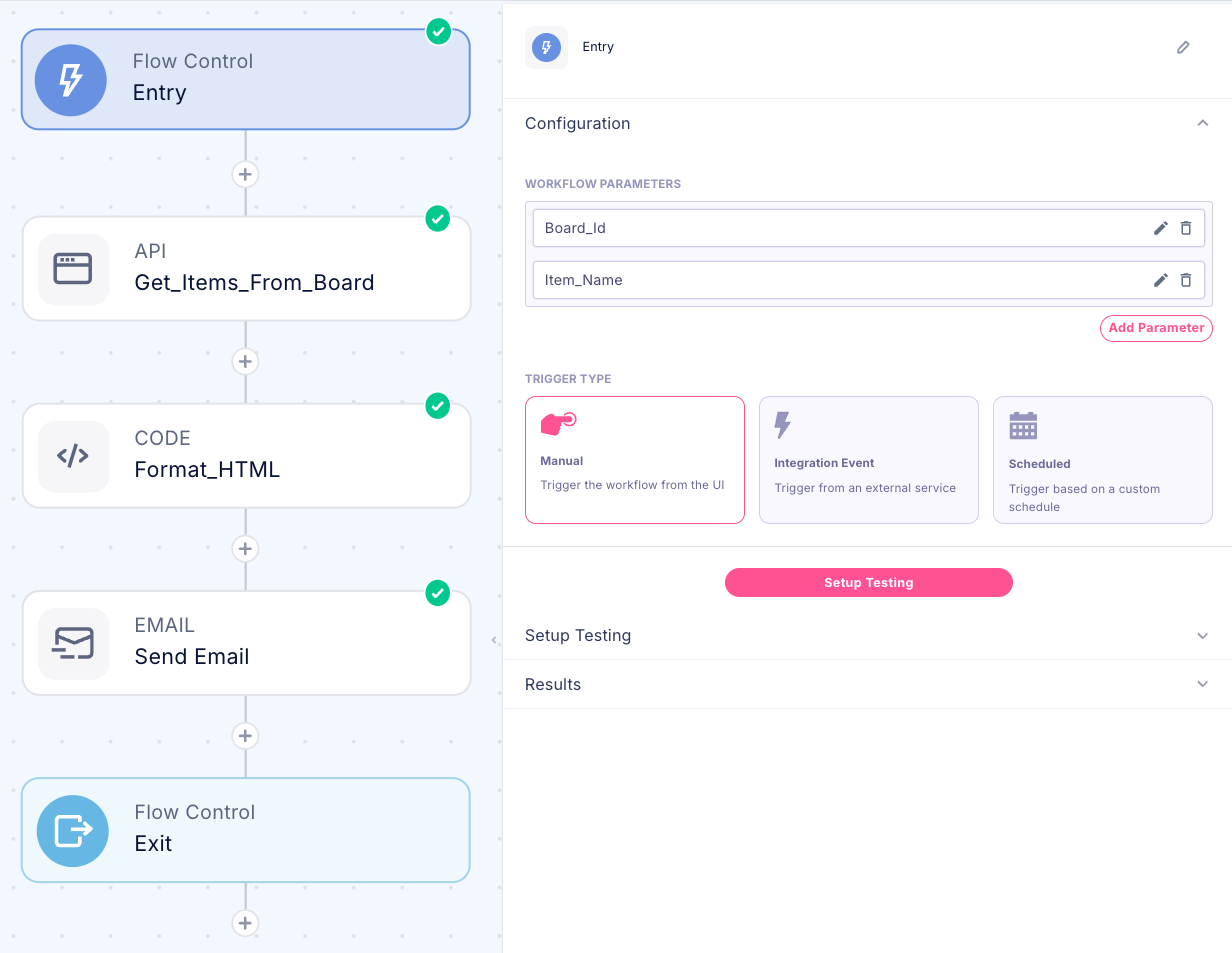 Entry Parameters: The workflow accepts the target Monday.com board ID