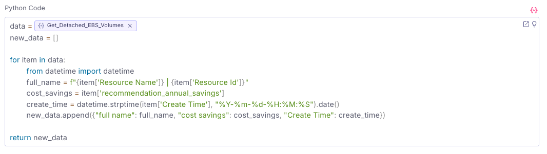 Now we just need to replace the data with the list from the Detached EBS step's output to make sure we have all the items