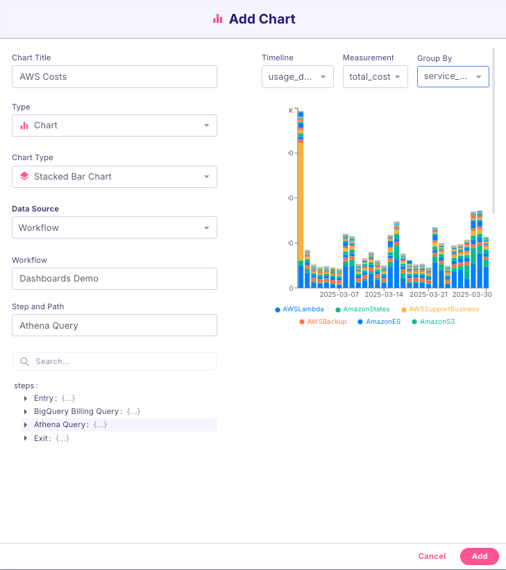 - Let's call the first one AWS Costs and select the workflow we just build. One the steps are loaded, select the Athena step output.