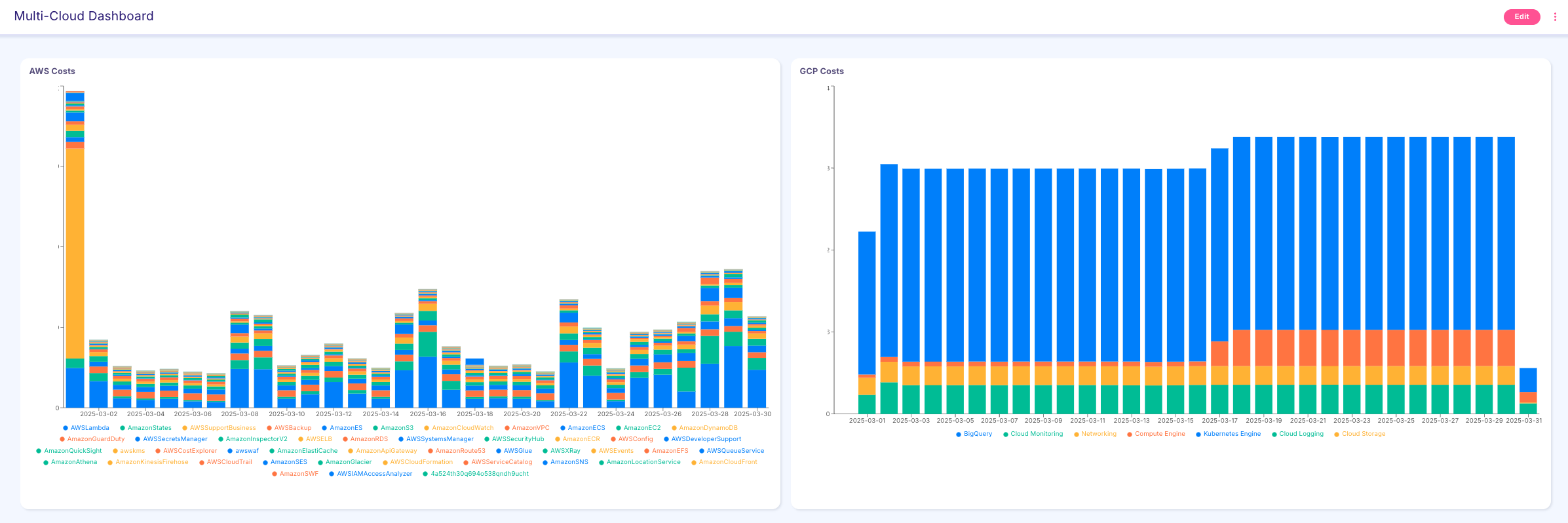 These standardized outputs from your GCP and AWS queries provide a solid foundation for creating comparative visualizations across your multi-cloud environment. The consistent data structure ensures seamless aggregation and analysis despite the different underlying cloud platforms.