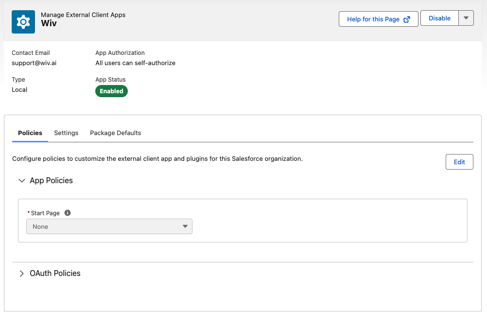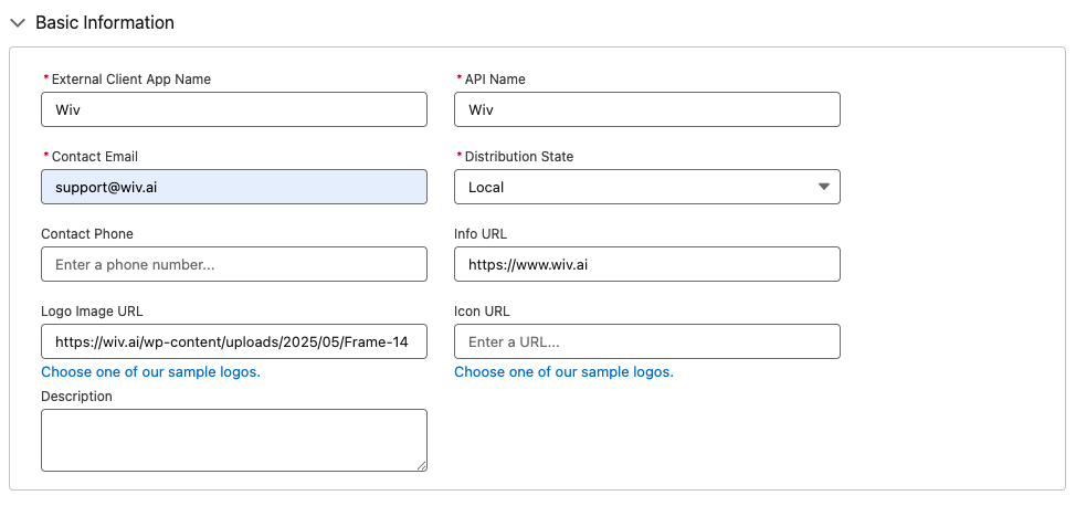 Create a Salesforce External Client App named Wiv
