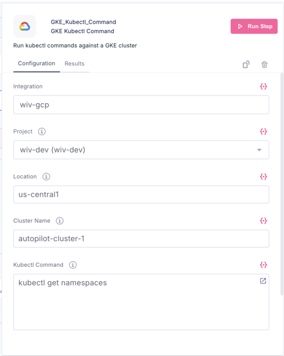 - The step handles GKE authentication automatically using the selected integration